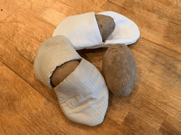 To use your new potato project, slightly wet it under running water and insert a potato that has been pierced a couple of times with a fork. Microwave for 10-12 minutes, flipping once, until soft and easily pierced with a fork or knife.