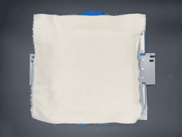 Step 3: Lightly spray one of the 10×10-inch brown/neutral cotton fabric squares with temporary embroidery spray, then lay the towel piece halfway. Fold over the fabric, and you’ll have a towel piece sandwiched by fabric.