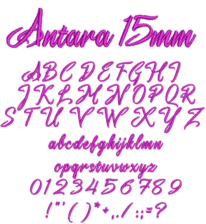 Antara 15mm font comes in an .ESA file format. It loads directly into your Hatch or Wilcom E series software to be used as a keyboard font. For best results, we suggest that you keep the size of this particular font at 15mm or greater.