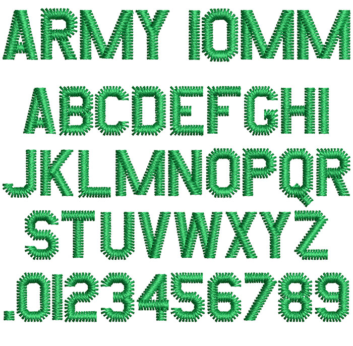 Army 10mm Font comes in an .ESA file format. It loads directly into your Hatch or Wilcom E series software to be used as a keyboard font. For best results, we suggest that you keep the size of this particular font at 10mm or greater.