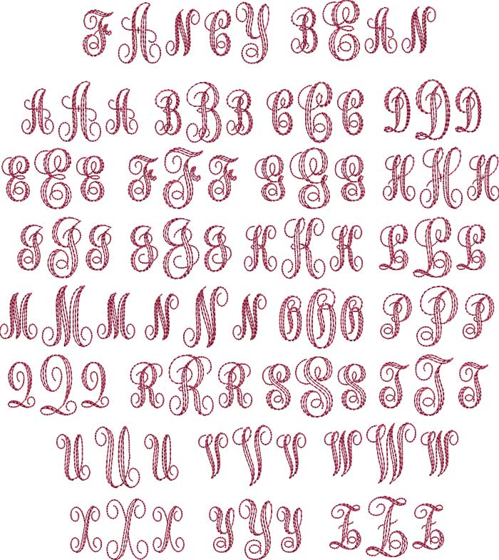 BX Embroidery Font: Fancy Monogram Bean is an upright script, stylized, fancy, 3-letter monogram machine embroidery font that includes A-Z (left, right, center) (78 total characters). 4 sizes.