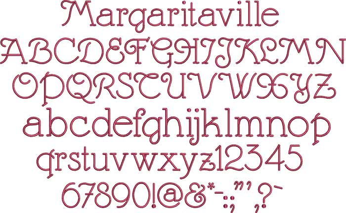 BX Embroidery Font: Margaritaville is a decorative, curly serif machine embroidery font that includes A-Z, a-z, 0-9 and the following punctuation: `!@#$&*():;”‘,.? (78 total characters).
