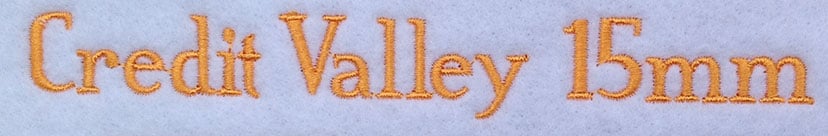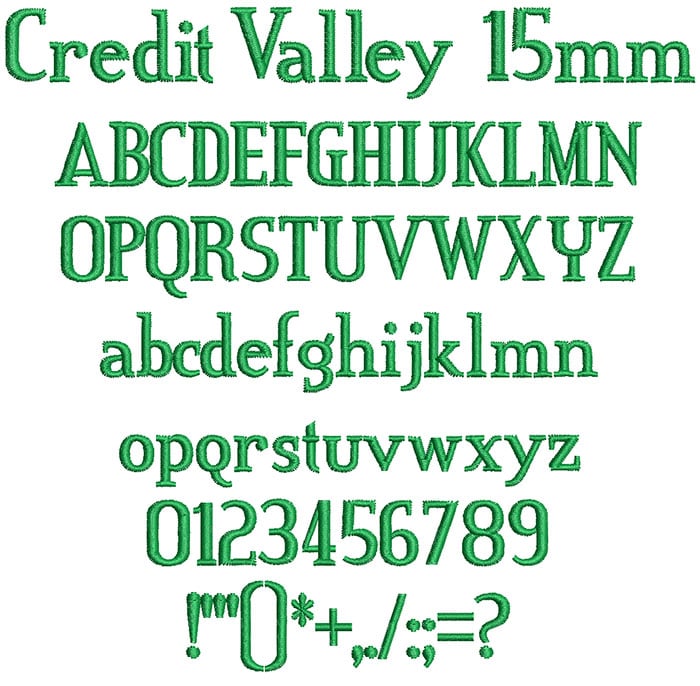 Credit Valley 15mm Font comes in an .ESA file format. It loads directly into your Hatch or Wilcom E series software to be used as a keyboard font. For best results, we suggest that you keep the size of this particular font at 15mm or greater.