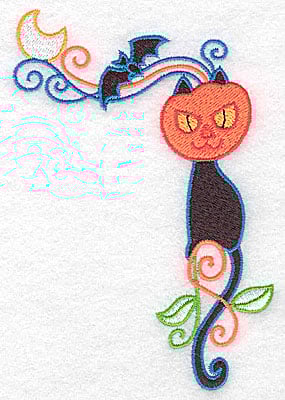 Embroidery Design: Black cat with pumpkin head and bat 3.34w X 4.96h
