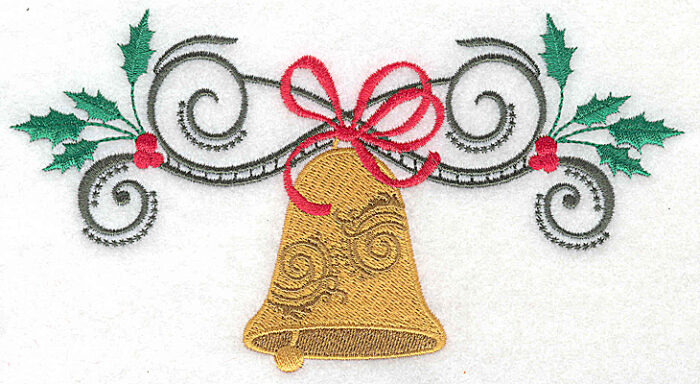Embroidery Design: Christmas Bell with bow swirls and holly 6.95w X 3.76h