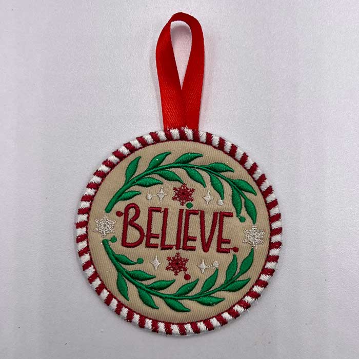 Stitch a little Christmas magic with this sweet in-the-hoop believe ornament. It’s perfect for gifting, decorating, or creating a keepsake full of holiday spirit.