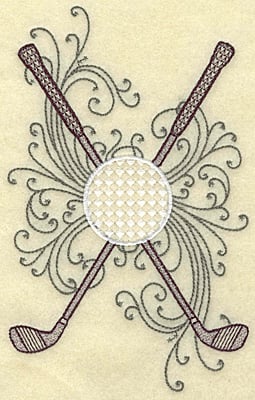 Embroidery Design: Crossed golf clubs ball and swirls 2 Sizes