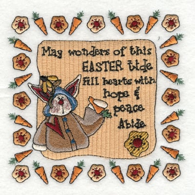 Machine embroidery design: snickerdoodle think spring carrots rabbit bunny May wonders of this Easter tide fill Hearts with Hope & Peace Abide easter tide fill hearts with hope & peace