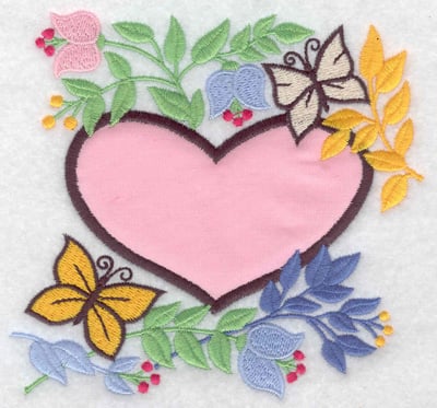 Embroidery Design: Heart applique flowers and butterflies 4.98w X 4.79h