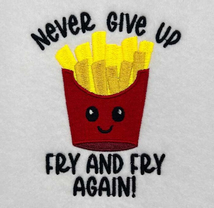 SD Cute Positivity, Never Give Up Fry and Fry Again!, saying, motivational, french fries, chips, food, snack