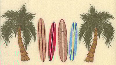 Embroidery Design: Palm Trees with Four Surf Boards 11.6w X 6.04h