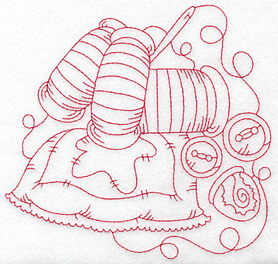 Quilt Lovers Redwork, redwork, red, work, line, linework, sketch, sketching, Quilt spools and thread redwork, Quilt, quilting, spools, thread, needle, buttons, sew, sewing, button, design, decoration, decorative, satin, bow, ribbon,