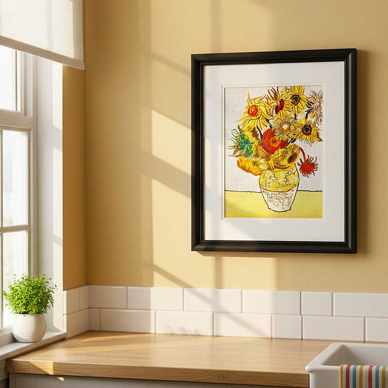 Perfect for statement pieces, home décor, or meaningful gifts, this design adds a touch of classic art with a handcrafted feel. Whether stitched as a centerpiece or paired with complementary elements, Twelve Sunflowers is sure to stand out and make a lasting impression.