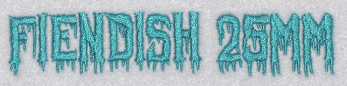 Fiendish 25mm Font comes in an .ESA file format. It loads directly into your Hatch or Wilcom E series software to be used as a keyboard font. For best results, we suggest that you keep the size of this particular font at 25mm or greater.
