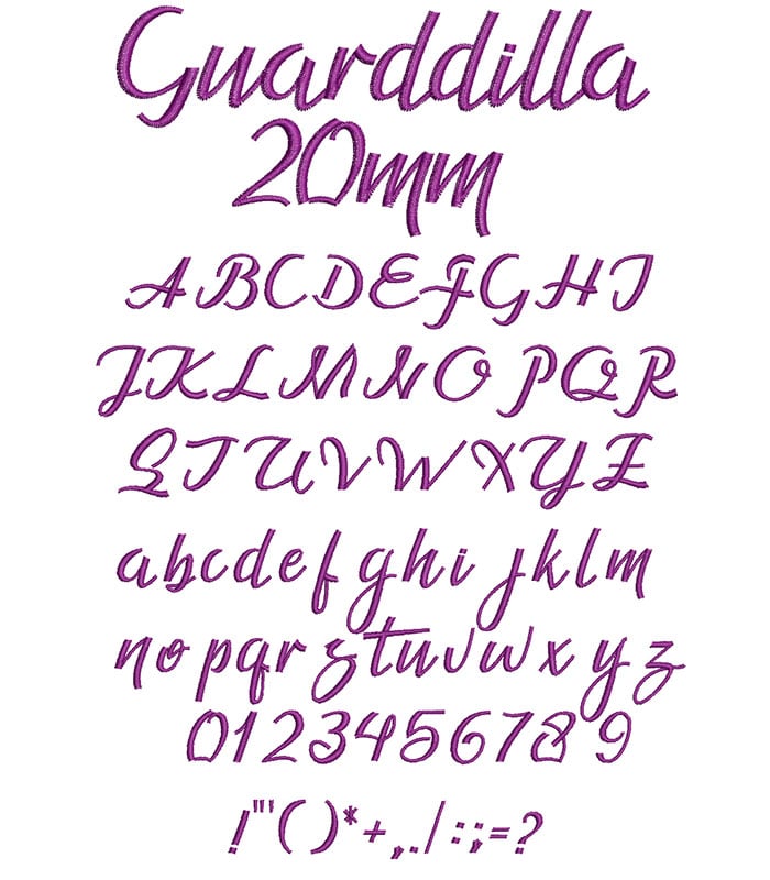 Guarddilla 20mm Font comes in an .ESA file format. It loads directly into your Hatch or Wilcom E series software to be used as a keyboard font. For best results, we suggest that you keep the size of this particular font at 20mm or greater. Click here to learn how to install this font.