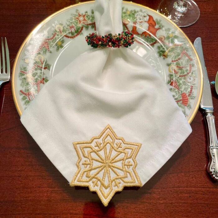 christmas project, festive, ith napkin, in the hoop, napkin, napkin project, snowflake napkin, cutwork, cutwork snowflake, cutwork snowflake napkin 3