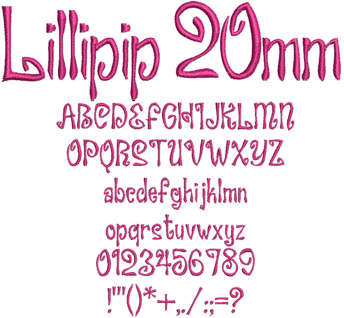 Lillipip 20mm Font comes in an .ESA file format. It loads directly into your Hatch or Wilcom E series software to be used as a keyboard font. For best results, we suggest that you keep the size of this particular font at 20mm or greater.