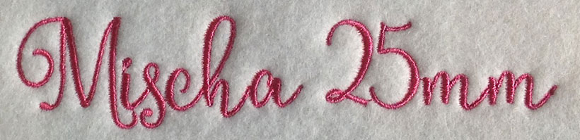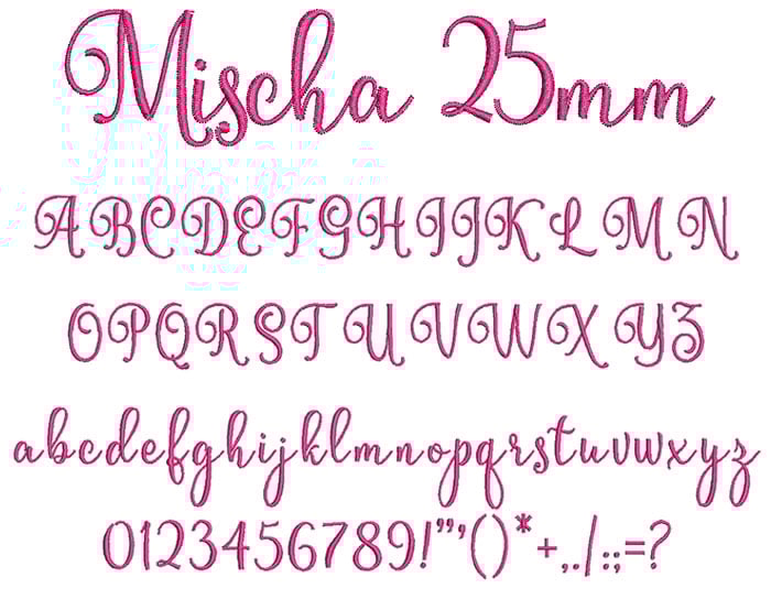 Mischa 25mm Font comes in an .ESA file format. It loads directly into your Hatch or Wilcom E series software to be used as a keyboard font. For best results, we suggest that you keep the size of this particular font at 25mm or greater.