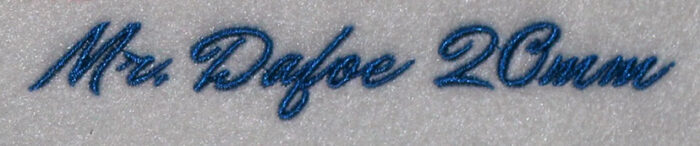 Mr. Dafoe 20mm Font comes in an .ESA file format. It loads directly into your Hatch or Wilcom E series software to be used as a keyboard font. For best results, we suggest that you keep the size of this particular font at 20mm or greater.