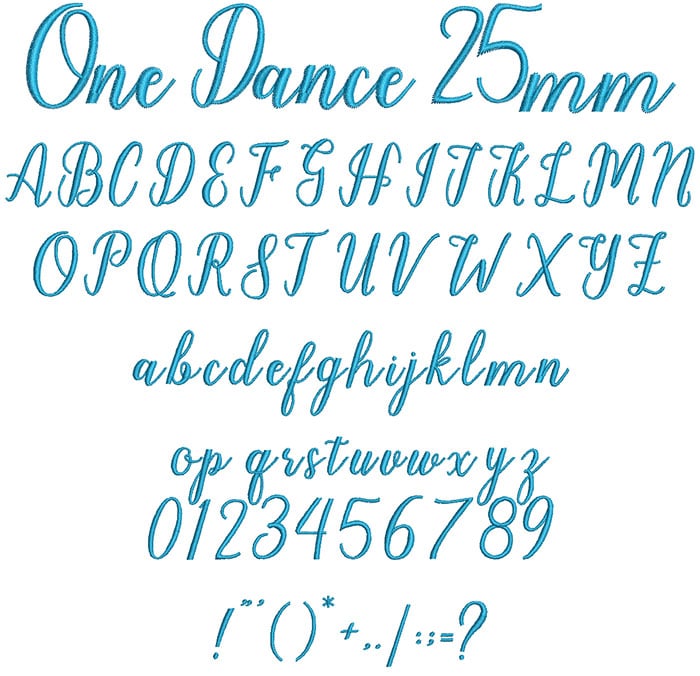 One Dance 25mm Font comes in an .ESA file format. It loads directly into your Hatch or Wilcom E series software to be used as a keyboard font. For best results, we suggest that you keep the size of this particular font at 25mm or greater.