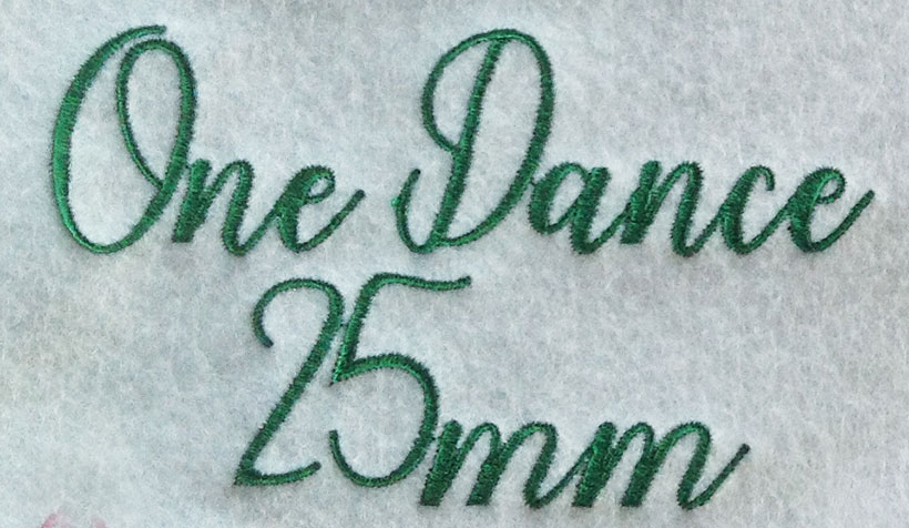 One Dance 25mm Font comes in an .ESA file format. It loads directly into your Hatch or Wilcom E series software to be used as a keyboard font. For best results, we suggest that you keep the size of this particular font at 25mm or greater. Click here to learn how to install this font.