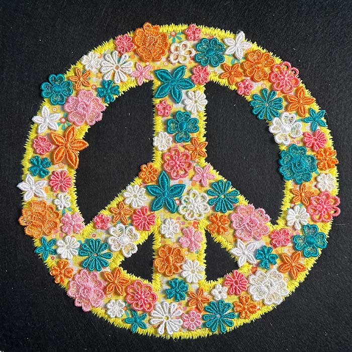 Spread a message of peace and beauty with this vibrant floral deco peace symbol, created easily in-the-hoop! Filled with colorful embroidered flowers, it adds unique artistic flair and positive vibes to any project. Use this standout design to personalize clothing, bags, home decor, or create thoughtful gifts.