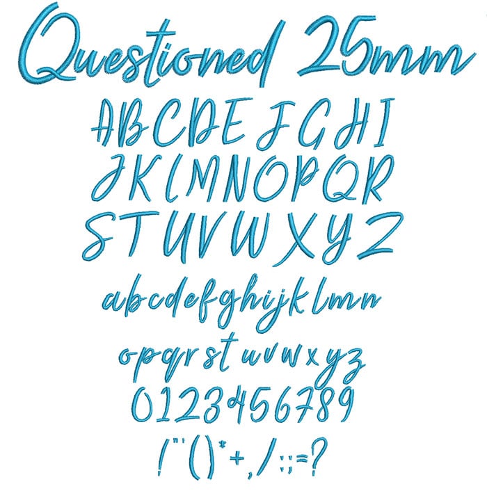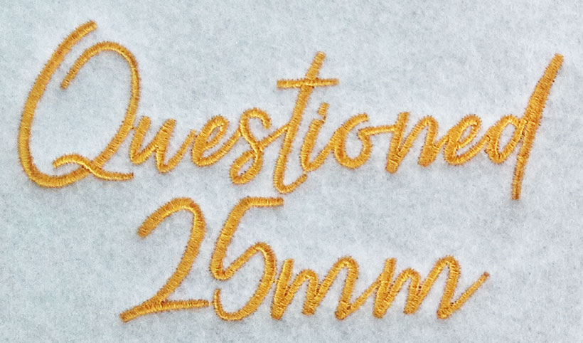 Questioned 25mm Font comes in an .ESA file format. It loads directly into your Hatch or Wilcom E series software to be used as a keyboard font. For best results, we suggest that you keep the size of this particular font at 25mm or greater.