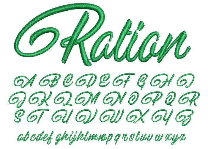 Ration 20mm font comes in an .ESA file format. It loads directly into your Hatch or Wilcom E series software to be used as a keyboard font. For best results, we suggest that you keep the size of this particular font at 20mm or greater.