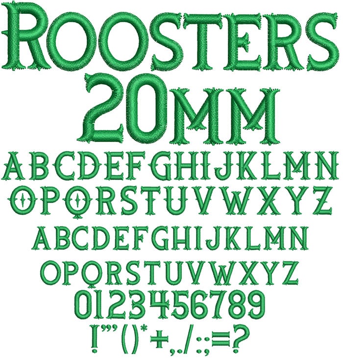 Roosters 20mm Font comes in an .ESA file format. It loads directly into your Hatch or Wilcom E series software to be used as a keyboard font. For best results, we suggest that you keep the size of this particular font at 20mm or greater.